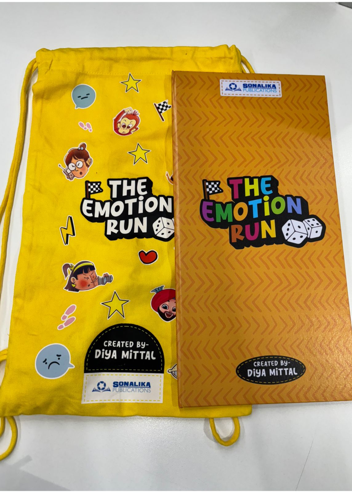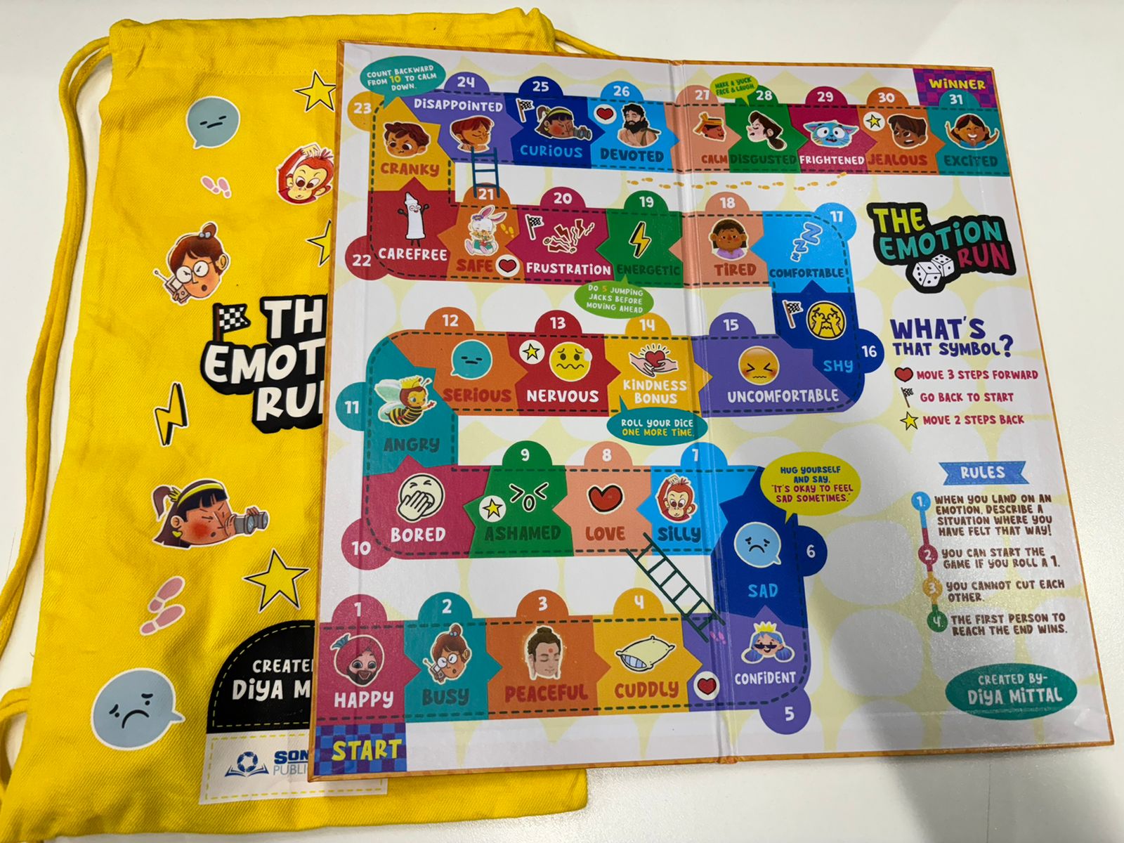 The Emotion Run is not your average board game. It comes with a dice, four tokens, a vibrant board, and a bag full of emotions!